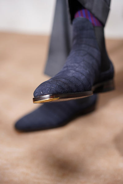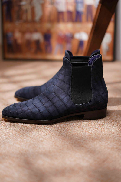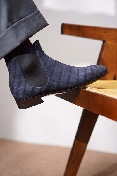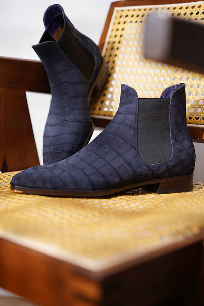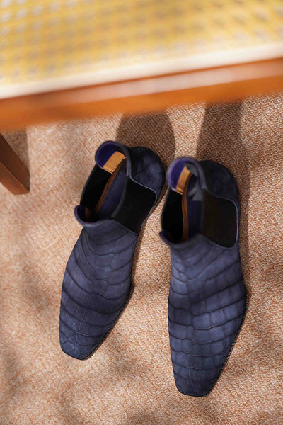 Now, let's compare Nubuck to other leather brands out there. Today, we're shining the spotlight on the Nubuck Alligator Chelsea Boots from TWINKIMA.G. These shoes are custom-crafted for a friend of the brand and they perfectly complement his casual yet refined style. He's a fan of clean, minimalistic looks, and these alligator Nubuck Chelsea boots are the perfect finishing touch. Pairing simple shoes with premium leather is truly the epitome of "Less is more" in American fashion.